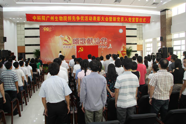 6月24日上午,廣州生物院隆重集會,召開紀念建黨90周年創(chuàng)先爭優(yōu)表彰大會暨新黨員入黨宣誓儀式。院領(lǐng)導班子全體成員與全體黨員、入黨積極分子以及共青團員一起出席了大會。大會由副院長朱詠峰主持。