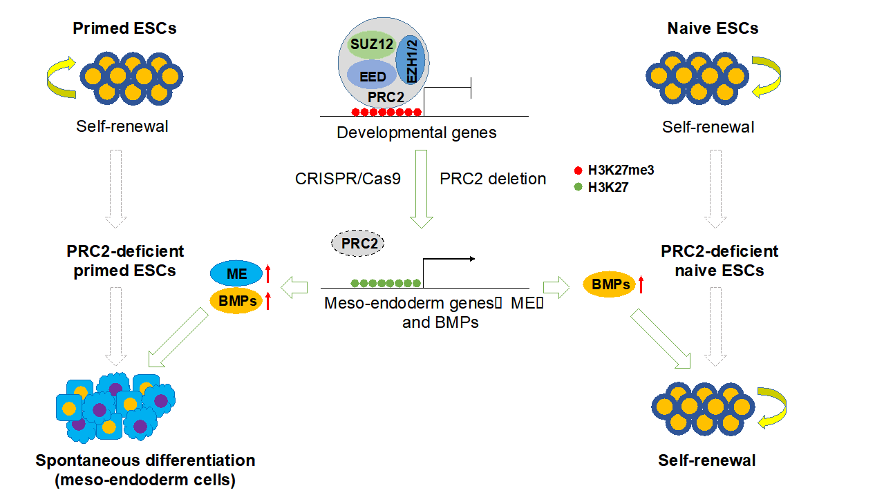 系統(tǒng)闡釋了PRC2復(fù)合物及其介導(dǎo)的組蛋白修飾在人多能干細(xì)胞干性退出及早期三譜系細(xì)胞命運決定的作用機制。