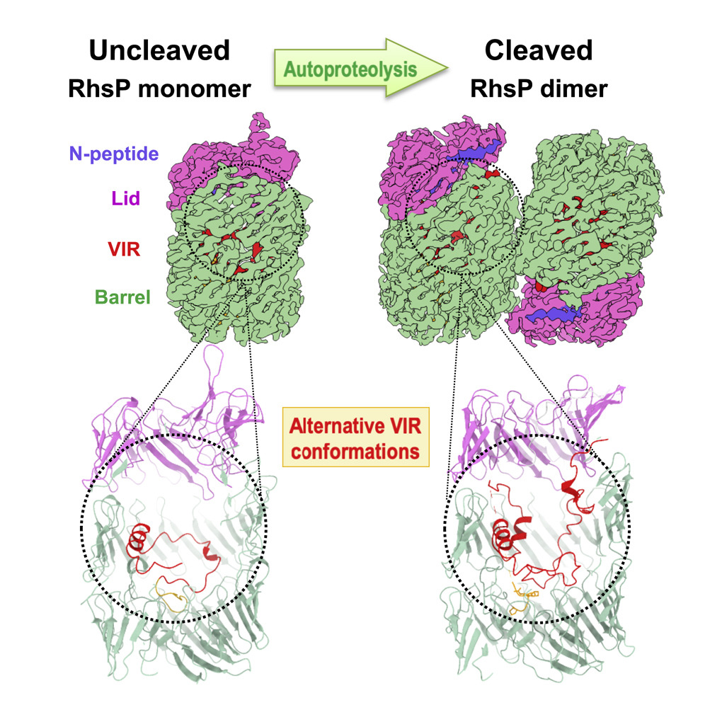 利用單顆粒冷凍電鏡技術首次揭示細菌分泌的毒素效應蛋白RhsP自水解前后的構象變化,并闡明二聚體的形成對于靶向獵物細胞有重要作用。