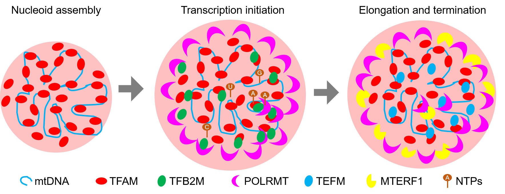 ?提出TFAM-mtDNA共相分離介導(dǎo)線粒體類核自組裝新模型,發(fā)現(xiàn)多相相分離介導(dǎo)類核多層結(jié)構(gòu)形成,并調(diào)控線粒體轉(zhuǎn)錄的新機制。