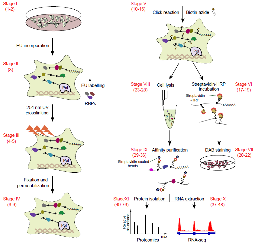 展示捕獲新生RNA結(jié)合蛋白組的工作原理和操作流程。