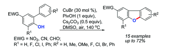 二苯并呋喃是許多活性藥物分子和天然產(chǎn)物的核心結(jié)構(gòu)單元。但是傳統(tǒng)的合成方法存在合成路線(xiàn)長(zhǎng),原子利用率低等諸多缺點(diǎn)。中科院廣州生物院朱強(qiáng)博士研究組利用銅催化的C?H鍵活化方法成功合成了一系列的二苯并呋喃及其衍生物,相關(guān)成果近期發(fā)表在美國(guó)化學(xué)會(huì)期刊《有機(jī)化學(xué)快報(bào)》上 (Org. Lett. 2012, 14, 1078–1081.)。