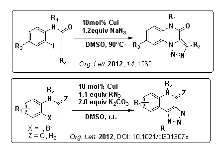 中科院廣州生物醫(yī)藥與健康研究院蔡倩博士與丁克博士研究組利用銅催化的[3+2]環(huán)化/Ullmann類偶聯(lián)串聯(lián)反應(yīng)的方法,通過分子內(nèi)捕捉[3+2]環(huán)化反應(yīng)中產(chǎn)生的高活性有機(jī)金屬銅中間體,高效的實(shí)現(xiàn)了分子內(nèi)新的芳基C-N鍵或C-C鍵的形成,發(fā)展了合成[1,2,3]三氮唑[1,5-a]喹喔啉-4(5H)-酮及[1,2,3]三氮唑[4,5-c]喹啉-4-酮這兩類化合物的新方法。
