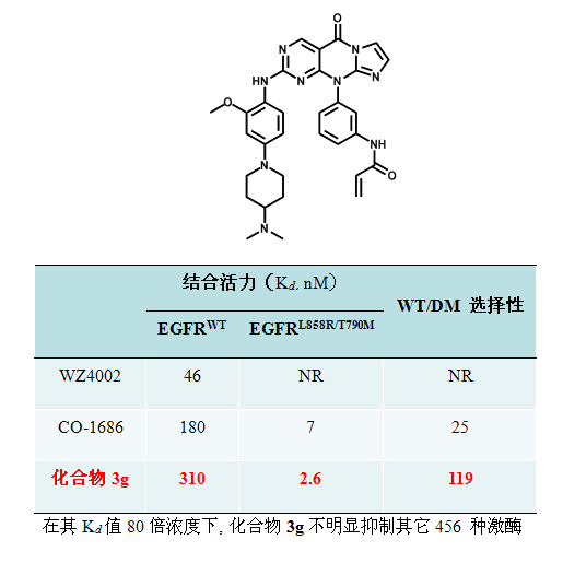 開發(fā)具有高特異性EGFR T790M突變體抑制劑已成為解決Gefitinib等藥物臨床耐藥的一個重要策略,但進展緩慢。2009 年Nature雜志報道得第一個選擇性了EGFR T790M非可逆抑制劑WZ4002,但因為知識產(chǎn)權糾紛無法進一步開發(fā);2012年美國Clovis Oncology 公司才啟動了其選擇性的EGFRT790M 突變體抑制劑CO-1686的I期臨床研究,但該化合物選擇性一般,僅為25倍(Kd(EGFRWT)/ Kd(EGFRL858R/T790M ) = 25)。