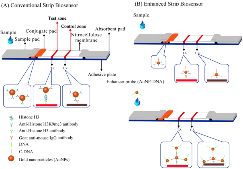 研究人員采用信號增強的試紙條生物傳感器用于組蛋白甲基化的檢測。有別于傳統(tǒng)的試紙條,這種新型的試紙條中引入了一個信號增強探針(AuNP-DNA),實現(xiàn)了對檢測信號的進一步放大。選擇HeLa細胞中的組蛋白H3K9三甲基化(me3)作為研究對象,在0.02ug的HeLa細胞組蛋白提取液中就能檢測到,比傳統(tǒng)的試紙條和western blot的靈敏度分別提高了10倍和15倍。該方法簡便快速,實驗結(jié)果在15分鐘內(nèi)用肉眼就能觀察到,避免了western blot的操作步驟復(fù)雜,操作時間長等缺點。這個方法同樣適用于其他類型的組蛋白甲基化,乙?;揎椀龋哂衅毡檫m用性。