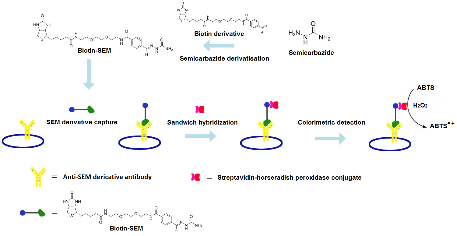 中科院廣州生物醫(yī)藥與健康研究院曾令文研究團(tuán)隊開發(fā)了一種簡潔、穩(wěn)定的氨基脲前處理試劑及方法,并建立一種基于夾心法的氨基脲小分子 ELISA 檢測方法,檢測靈敏度為0.07 μg /L,比常規(guī)方法提高10倍左右,足以滿足呋喃西林現(xiàn)場快速篩查需要。相關(guān)成果發(fā)表在Chem.Comm.上。