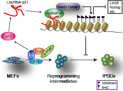 研究人員通過這個方法結(jié)合RNA干擾實驗發(fā)現(xiàn),降低p53誘導產(chǎn)生的一個lncRNA(稱作lincRNA-p21)的表達能夠明顯促進體細胞重編程的發(fā)生,過表達則反過來抑制此過程。實驗室進一步作用機理的研究發(fā)現(xiàn),lincRNA-p21影響重編程的產(chǎn)生是不依賴于由p53引起的細胞調(diào)亡和增殖。它可以跟核內(nèi)不均一蛋白HNRNPK相互作用,并且通過HNRNPK來“招募”抑制性表觀遺傳修飾的蛋白因子SETDB1和DNMT1,形成兩個復合物分別行使維持相關(guān)多能性基因啟動子區(qū)H3K9me3和CpG甲基化的功能。這一研究證實了長鏈非編碼RNA可以通過調(diào)控表觀遺傳修飾來阻礙重編程的發(fā)生,進一步闡述了體細胞逆轉(zhuǎn)過程中l(wèi)ncRNA的重要性,同時也豐富了p53對重編程的作用機理,對以后進一步的臨床應用具有指導性意義。