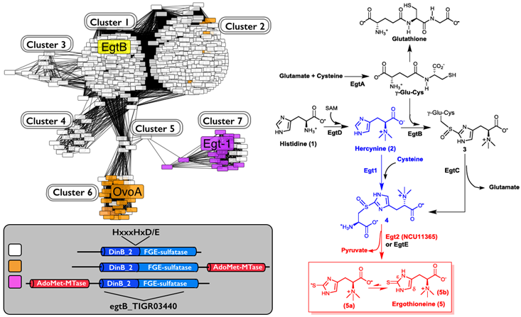 2010年, Seebeck在恥垢分枝桿菌(Mycobacterium smegmatis)中發(fā)現(xiàn)了麥角硫因的生物合成通路,分別涉及EgtA,EgtB,EgtC,EgtD和EgtE五個酶促反應(yīng)步驟。但是,在該通路中,麥角硫因和谷胱甘肽生物合成都要利用γ-谷氨酸-半胱氨酸作為底物,由于谷胱甘肽是細(xì)胞生存必需的且細(xì)胞內(nèi)濃度高達(dá)0.5 mM~10 mM,這種競爭關(guān)系會嚴(yán)重影響麥角硫因合成的收率。其次,在該研究中, 由于EgtE不能表達(dá), C-S鍵裂解酶活性未被證實。