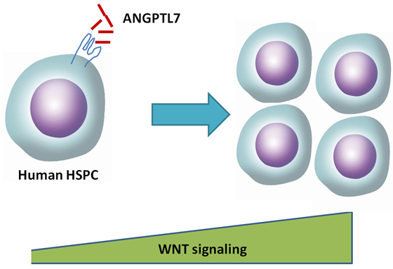 研究中,實(shí)驗(yàn)人員發(fā)現(xiàn)了一種可促進(jìn)人造血干細(xì)胞和祖細(xì)胞擴(kuò)增的鼠胚胎肝臟細(xì)胞系,該細(xì)胞特異性高表達(dá)Angptl7[l1] 蛋白。另外,研究還發(fā)現(xiàn)ANGPLT7蛋白可促進(jìn)人體造血干細(xì)胞和祖細(xì)胞在異種移植宿主體內(nèi)擴(kuò)增和造血系統(tǒng)重建。RNA-Seq分析結(jié)果顯示,ANGPTL7激活人體造血干細(xì)胞和組細(xì)胞中CXCR4、HOXB4和WNT下游靶點(diǎn)的表達(dá)。另外,通過(guò)化學(xué)調(diào)控WNT信號(hào)通路可以弱化ANGTPL7對(duì)人體造血干細(xì)胞和祖細(xì)胞的作用。