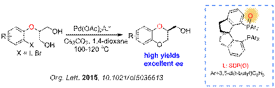 芳基醚和氧雜芳環(huán)是許多天然產(chǎn)物以及重要藥物分子中的關(guān)鍵結(jié)構(gòu)。過(guò)渡金屬催化的偶聯(lián)反應(yīng)是合成這類(lèi)結(jié)構(gòu)的重要方法。盡管目前Pd催化的芳基C-O偶聯(lián)反應(yīng)取得了很大的進(jìn)展,但光學(xué)選擇性的芳基C-O偶聯(lián)反應(yīng)并未引起廣泛的關(guān)注。主要是因?yàn)檫@類(lèi)反應(yīng)中,化學(xué)鍵形成于SP2雜化的芳基碳原子與氧原子之間,成鍵過(guò)程不直接涉及到中心手性的產(chǎn)生。并且對(duì)于Pd催化的C-O偶聯(lián)反應(yīng),特別是芳基鹵化物與一級(jí)或二級(jí)醇類(lèi)化合物的偶聯(lián)反應(yīng),存在競(jìng)爭(zhēng)性的b-H消除以及脫鹵等副反應(yīng),使偶聯(lián)反應(yīng)的收率偏低,應(yīng)用受到很大限制。