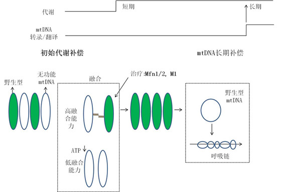劉興國研究組建立了新的細胞模型,并應用新的成像學方法,發(fā)現當線粒體的DNA喪失功能時,它們之間的同源融合能力很低,但是與正常線粒體保持了很高的異源融合能力從而在短時間內獲得代謝功能的補償,稱為“初始代謝補償”。本研究揭示了線粒體疾病中“閾值效應”的線粒體功能互補之謎:首先是短時的“初始代謝補償”,其次是長時的依賴于正常線粒體DNA表達的補償。更重要的是,研究組以“初始代謝補償”為線粒體疾病的新的治療靶點,篩選到了新的候選基因藥物及小分子藥物。
