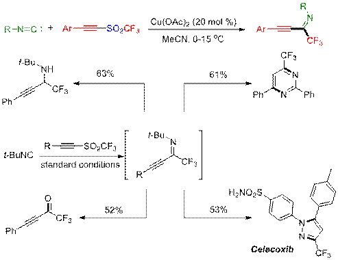 廣州生物院朱強(qiáng)博士與吳筱星博士合作,設(shè)計(jì)了異腈與三氟甲基炔基砜的反應(yīng),在異腈的末端碳原子上同時(shí)引入三氟甲基和炔基,得到相應(yīng)的構(gòu)型單一的酮亞胺。該反應(yīng)在醋酸銅的催化下,在0到15攝氏度的條件即能順利進(jìn)行,該方法操作簡單,條件溫和,無需其它添加劑。初步的機(jī)理研究表明,異腈與銅鹽的共同作用,引發(fā)三氟甲基炔基砜裂解成三氟甲基自由基是反應(yīng)的關(guān)鍵步驟。反應(yīng)產(chǎn)物三氟甲基炔基亞胺具有多個反應(yīng)位點(diǎn),可以進(jìn)行多種類型的后續(xù)化學(xué)轉(zhuǎn)化,如還原、共軛加成、水解、縮合環(huán)化等等。有些后續(xù)反應(yīng)可以不經(jīng)分離亞胺中間體,‘一鍋法’化得到結(jié)構(gòu)多樣性的含氟分子或雜環(huán)。例如利用該方法,一步就可以以53%的總收率得到抗炎癥藥物分子Celecoxib。