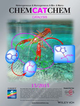 此外,研究人員在此工作的基礎上還發(fā)展了有機小分子催化的苯并三氮唑與alpha位取代的beta-硝基丙烯酸酯的不對稱aza-Michael反應,得到了含有苯并三氮唑結(jié)構(gòu)單元的手性季碳中心,該部分工作以內(nèi)封面論文發(fā)表在《化學催化》(ChemCatChem, 2015, 7, 1935-1938, Inside backcover)上。?