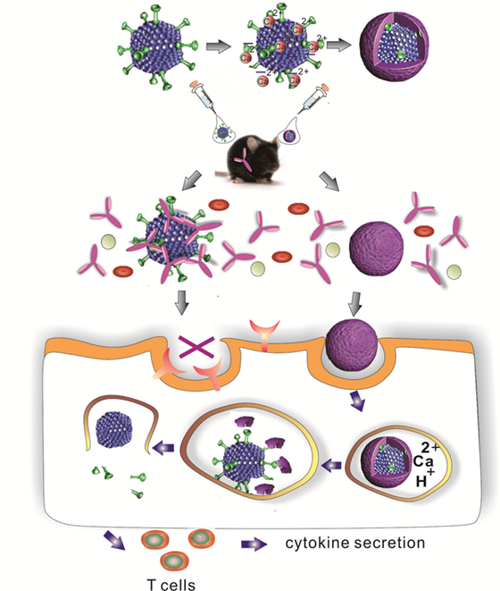 為克服體內(nèi)腺病毒中和抗體的這種負(fù)面影響,該團(tuán)隊(duì)科技人員創(chuàng)造性地將自然界中廣泛存在的生物礦化(biomineralization)現(xiàn)象應(yīng)用于修飾和提升疫苗的性能。以攜帶艾滋病抗原的腺病毒載體疫苗為模型,研究人員發(fā)現(xiàn)磷酸鈣鹽在一定條件下可在腺病毒表面形成一層礦化薄膜,猶如給病毒添加了一層“蛋殼”(Shell)。經(jīng)過一系列體內(nèi)外實(shí)驗(yàn)表明,BVSE技術(shù)可有效避免腺病毒載體疫苗被中和抗體識別,并高效感染靶細(xì)胞并促進(jìn)其攜帶的HIV的抗原基因的表達(dá)。同時(shí)還發(fā)現(xiàn)經(jīng)BVSE處理的疫苗表面攜帶的Ca2+離子兼有佐劑的功能,更有利于疫苗發(fā)揮更大潛能,激發(fā)出更有效的HIV病毒特異性的多功能性細(xì)胞免疫應(yīng)答,顯著地提高了HIV疫苗的免疫效果。本研究為提升腺病毒載體的使用效率和使用范圍提出了一種嶄新思路,對研發(fā)更有效地針對艾滋病、其它傳染性疾病和腫瘤的疫苗及免疫治療新策略具有重要科學(xué)意義和應(yīng)用價(jià)值。