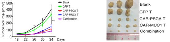 該研究進(jìn)一步利用PDX模型,在體內(nèi)證明了CAR-PSCA和CAR-MUC1嵌合抗原受體T細(xì)胞可以有效抑制PDX模型中腫瘤的生長(zhǎng)速度,而且CAR-PSCA和CAR-MUC1 T細(xì)胞聯(lián)合使用后,對(duì)腫瘤生長(zhǎng)的抑制程度更加明顯。
