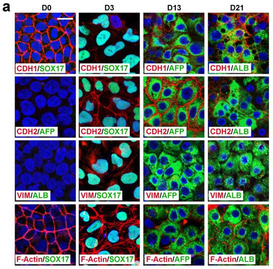 成熟肝臟細胞是典型的上皮細胞,可由其同屬上皮細胞的人胚胎干細胞通過體外定向分化而獲得。在上述研究中,科研人員發(fā)現(xiàn)這兩種上皮細胞之間的命運轉(zhuǎn)換需要經(jīng)過一個間充質(zhì)狀態(tài)的中間階段。在胚胎干細胞分化為定型內(nèi)胚層階段發(fā)生了EMT過程,而隨后進一步的肝系分化成熟過程伴隨著MET過程。