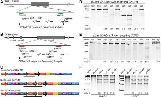 CD4+T細(xì)胞是HIV-1感染人體的主要靶細(xì)胞,也是艾滋病基因治療的重要功能性細(xì)胞。CCR5是HIV-1感染CD4+T細(xì)胞的主要共受體。隨著病毒感染的推進(jìn),病毒嗜性從R5-嗜性向X4-嗜性轉(zhuǎn)變,并最終導(dǎo)致患者進(jìn)展到AIDS期。因此,對(duì)于慢性期HIV-1感染者,同時(shí)敲除CXCR4和CCR5將可能阻斷任何單一嗜性和雙嗜性病毒的侵襲,從而提供雙重保護(hù),實(shí)現(xiàn)艾滋病的功能性治愈。