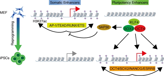 研究發(fā)現(xiàn),在轉(zhuǎn)變過程中,早期成纖維細胞的很多特異性開放位點會被迅速關(guān)閉(OC),而到重編程后期很多多能性相關(guān)的位點則會被打開(CO)??蒲袌F隊認為開關(guān)的事件是直接與轉(zhuǎn)錄因子活性相關(guān),因此對CO/OC位點的基序(motif)進行深入分析。分析發(fā)現(xiàn),CO位點顯著的富集出了重編程因子OCT、SOX、KLF的基序(motif),這與使用的重編程因子Oct4/Sox2/Klf4是吻合的,但CO的過程是非常緩慢的。在更加快速的OC過程中,在OC位點上特異富集出了很強的成纖維細胞特異性的轉(zhuǎn)錄因子,例如AP-1,ETS,TEAD,RUNX等家族成員,而沒有OCT等重編程因子,證明體細胞相關(guān)染色質(zhì)關(guān)閉(OC)過程是OCT、SOX、KLF非依賴的過程。進一步研究發(fā)現(xiàn),與染色質(zhì)關(guān)閉(OC)過程相關(guān)的因子都是體細胞重編程的重要障礙。那么,關(guān)閉這些位點的OC過程優(yōu)勢如何在操作呢?通過進一步篩選,研究發(fā)現(xiàn),表觀修飾基因Sap30在體細胞重編程早期被重編程因子激活,并通過促進成纖維細胞關(guān)鍵基因啟動子區(qū)去乙?;揎?,而使其啟動子區(qū)逐漸關(guān)閉,最終沉默成纖維細胞關(guān)鍵調(diào)控基因,推動重編程進程。這部分研究結(jié)果首次揭示體細胞重編程過程中染色質(zhì)結(jié)構(gòu)動態(tài)變化的規(guī)律—CO/OC邏輯,并為理解體細胞重編和其他相關(guān)細胞命運轉(zhuǎn)變提供了新的可參考的理論模型。