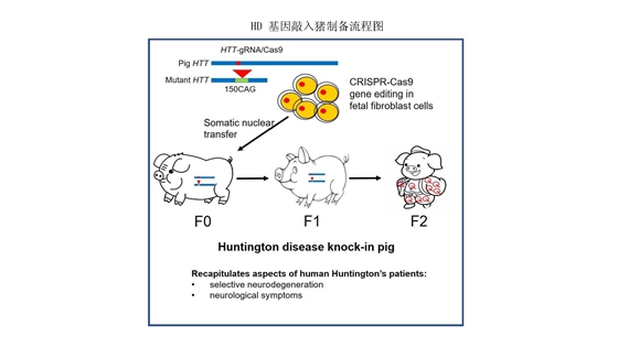 利用基因編輯技術(shù)(CRISPR/Cas9)等培育出世界首例亨廷頓舞蹈病基因敲入豬