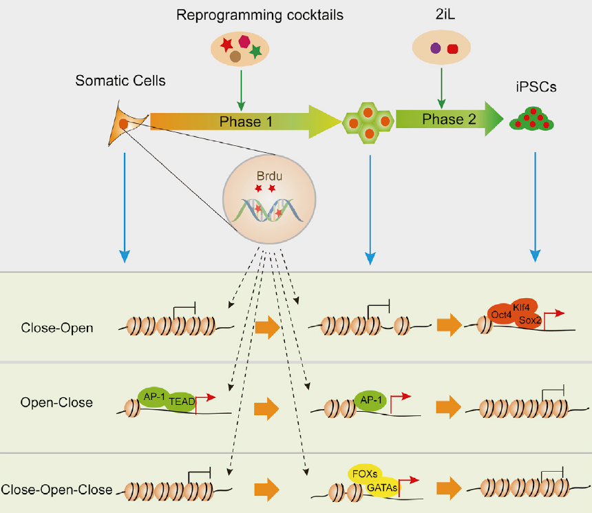 這些神奇的“魔法藥水”是如何將成體細(xì)胞誘導(dǎo)到胚胎發(fā)育早期的多能干細(xì)胞狀態(tài)的呢?裴端卿說,在個(gè)體中,所有的細(xì)胞都擁有同樣的染色質(zhì),為什么會(huì)形成形態(tài)各異、功能不同的各種細(xì)胞呢?原來,細(xì)胞在發(fā)生可識別的形態(tài)變化之前,就因受到約束而向特定方向分化,確定了其未來的發(fā)育命運(yùn)。團(tuán)隊(duì)研究發(fā)現(xiàn),細(xì)胞的命運(yùn)受到細(xì)胞核內(nèi)部的“信息中樞”染色質(zhì)的狀態(tài)控制。細(xì)胞染色質(zhì)的開放(1)與關(guān)閉(0)狀態(tài)總和,構(gòu)成了決定細(xì)胞命運(yùn)狀態(tài),這種情況就猶如計(jì)算機(jī)二進(jìn)制的“密碼串”,進(jìn)而將細(xì)胞“鎖”在了特定狀態(tài)。