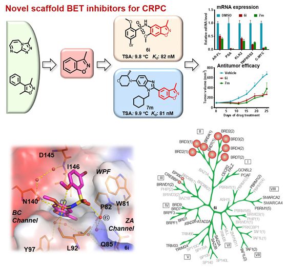許永研究員團(tuán)隊長期致力于創(chuàng)新藥靶發(fā)現(xiàn)與確證和創(chuàng)新藥物開發(fā)研究。團(tuán)隊前期以前列腺癌耐藥等尚未滿足的臨床需求為導(dǎo)向,以計算生物學(xué)、藥物分子設(shè)計等理論策略為驅(qū)動,建立了藥物化學(xué)、化學(xué)生物學(xué)、結(jié)構(gòu)生物學(xué)等多學(xué)科交叉技術(shù)平臺。在此平臺基礎(chǔ)上,發(fā)展了苯并吲哚酮(Y02224,J. Med. Chem. 2016, 59, 1565-1579)和苯并噁嗪酮(Y08060,ACS Med. Chem. Lett. 2018, 9, 262-267)類BET溴結(jié)構(gòu)域抑制劑。近期,該團(tuán)隊又開發(fā)了一類新型苯并[d]異噁唑類BET溴結(jié)構(gòu)域抑制劑,通過分子對接和復(fù)合物晶體結(jié)構(gòu)信息為指導(dǎo),最終獲得了磺酰胺類和苯并咪唑類兩類高效的特異性BET溴結(jié)構(gòu)域抑制劑。這些化合物對前列腺癌等表現(xiàn)出良好的體內(nèi)外抗腫瘤活性。?