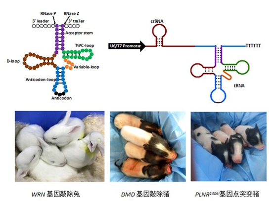 CRISPR/Cpf1是一種新型RNA引導(dǎo)的基因編輯工具,與目前廣泛應(yīng)用的CRISPR/Cas9相比,有更高的特異性,脫靶率更低,并且Cpf1能識別富含T堿基的間隔物相鄰基序(PAM),擴(kuò)大了CRISPR基因編輯系統(tǒng)的使用范圍。但其靶向效率要低于Cas9,限制了Cpf1在基因編輯中的實際應(yīng)用,目前僅在人類細(xì)胞系和小鼠胚胎中有過相關(guān)報道,還沒用在大動物中實現(xiàn)有效的基因編輯。在本研究中,研究人員開拓性地利用哺乳動物轉(zhuǎn)運RNA(tRNA)內(nèi)源剪切機制,對Cpf1 引導(dǎo)RNA(gRNA)進(jìn)行了改造,極大地提高了Cpf1在細(xì)胞系和動物胚胎中的基因編輯效率。課題組應(yīng)用經(jīng)改造的新型Cpf1 基因編輯系統(tǒng),成功獲得了首例Cpf1基因修飾家兔和豬模型。?