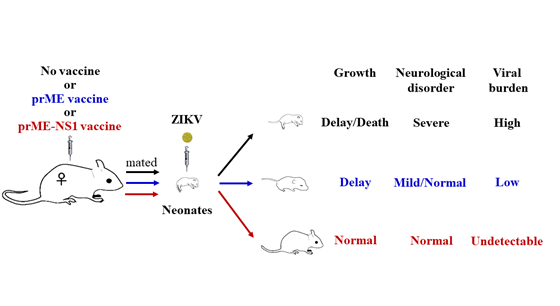 當(dāng)前寨卡病毒疫苗的設(shè)計(jì)主要以包膜蛋白(envelope, E)為抗原靶標(biāo),前體膜蛋白(pre-membrane, prM)作為伴侶蛋白也常納入疫苗設(shè)計(jì)。非結(jié)構(gòu)蛋白1(non-structual protein 1,NS1)雖然在寨卡病毒復(fù)制、致病中起關(guān)鍵作用,但尚無研究以其作為抗原靶標(biāo)。本研究中,研究人員以復(fù)制缺陷型2型腺病毒作為載體,探索了僅攜帶E,攜帶prM、E,攜帶prM、E以及NS1的三種疫苗策略。結(jié)果發(fā)現(xiàn)含NS1抗原組份的疫苗策略不僅在母鼠中有效抵御病毒血癥,還能保護(hù)新生鼠免受寨卡病毒感染導(dǎo)致的體重減少、神經(jīng)癥狀等,顯著抑制病毒對新生鼠的感染。該研究表明prM、NS1的納入可顯著提升免疫保護(hù)效果,提示NS1可以做為寨卡病毒疫苗的抗原組份,值得進(jìn)一步評估和開發(fā)。