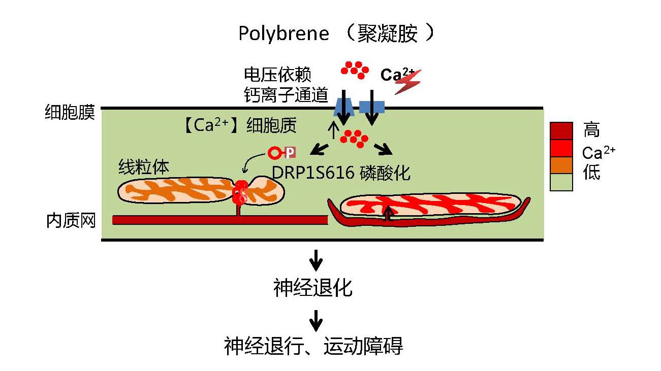 劉興國課題組通過體內(nèi)外模型研究了低劑量polybrene對(duì)神經(jīng)系統(tǒng)的毒性。在體內(nèi)方面,側(cè)腦室注射polybrene造成小鼠行為學(xué)(運(yùn)動(dòng)障礙)和病理學(xué)(神經(jīng)死亡和膠質(zhì)增生)上的神經(jīng)退行表型。在體外方面,polybrene會(huì)導(dǎo)致人誘導(dǎo)多能干細(xì)胞(iPSCs)分化來源的神經(jīng)元出現(xiàn)退化。進(jìn)一步發(fā)現(xiàn)polybrene激活VDCC門控的胞外鈣內(nèi)流,導(dǎo)致了神經(jīng)元胞內(nèi)鈣濃度的異常升高;升高的胞內(nèi)鈣雙向調(diào)控兩種細(xì)胞器異常重塑:DRP1S616位磷酸化介導(dǎo)的線粒體斷裂和代謝異常,內(nèi)質(zhì)網(wǎng)片段化并和線粒體耦合介導(dǎo)線粒體鈣超載,從而啟動(dòng)神經(jīng)退化。