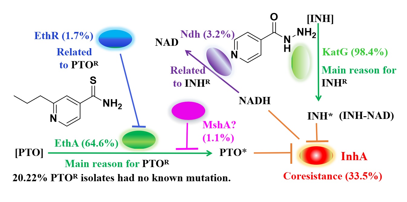 耐藥結(jié)核病分為單耐藥(主要是對利福平或異煙肼,Isoniazid,INH,俗稱雷米封)、多耐藥(對一種以上一線抗結(jié)核藥物耐藥,不包括同時對異煙肼和利福平耐藥)、耐多藥(MDR,至少對利福平和異煙肼耐藥),廣泛耐藥(XDR, MDR加上至少對一種注射藥物且對一種喹諾酮類藥物耐藥),甚至是完全耐藥(TDR,對所有測試的藥物都耐藥)。可見,異煙肼耐藥在耐藥結(jié)核菌上的嚴重性。丙硫異煙胺(Prothionamide,PTO)是臨床上用于治療耐藥結(jié)核的二線殺菌藥物,具有效果好,毒副作用低等特點。?