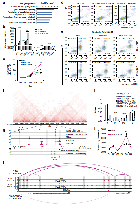 運(yùn)用一系列生物化學(xué)和分子生物學(xué)的研究方法,該研究團(tuán)隊(duì)揭示CTCF存在跳躍外顯子3和4的可變剪接體CTCF-s(蛋白序列缺失CTCF的N末端和2.5個(gè)鋅指結(jié)構(gòu))。運(yùn)用帶有生物素標(biāo)簽的CTCF和CTCF-s來(lái)特異性區(qū)分CTCF長(zhǎng)和短可變剪接體在基因組DNA結(jié)合基序的異同,發(fā)現(xiàn)CTCF長(zhǎng)和短可變剪接體在基因組上的結(jié)合基序雖有很大的相似性,但由于CTCF-s蛋白質(zhì)缺少鋅指結(jié)構(gòu)3(ZF3)(由24個(gè)氨基酸組成)的前7個(gè)氨基酸(HKCPDCD),因此不再擁有ZF3結(jié)合的核心基序(C/G和T/C)。與經(jīng)典CTCF的DNA結(jié)合基序相比,CTCF-s的DNA結(jié)合基序有2個(gè)堿基的缺失,正好對(duì)應(yīng)CTCF-s中缺失的鋅指結(jié)構(gòu)。通過(guò)使用特異性識(shí)別經(jīng)典CTCF的N末端的抗體富集CTCF結(jié)合的DNA,發(fā)現(xiàn)CTCF-s能夠競(jìng)爭(zhēng)性結(jié)合經(jīng)典CTCF在基因組的部分結(jié)合位點(diǎn),導(dǎo)致CTCF/Cohesin在這些結(jié)合位點(diǎn)上富集水平明顯下降。從染色質(zhì)高級(jí)結(jié)構(gòu)的調(diào)控方面,該研究團(tuán)隊(duì)發(fā)現(xiàn)過(guò)表達(dá)CTCF-s導(dǎo)致經(jīng)典CTCF在全基因組范圍介導(dǎo)的遠(yuǎn)距離染色質(zhì)相互作用能力顯著降低。另外該研究揭示CTCF-s可以促進(jìn)干擾素信號(hào)通路相關(guān)基因的表達(dá);進(jìn)一步發(fā)現(xiàn)CTCF-s通過(guò)破壞經(jīng)典CTCF在干擾素α誘導(dǎo)蛋白6(IFI6)基因區(qū)域的三維空間構(gòu)象而促進(jìn)IFI6基因遠(yuǎn)端增強(qiáng)子和啟動(dòng)子之間的相互作用而激活IFI6基因的表達(dá),從而導(dǎo)致細(xì)胞凋亡。