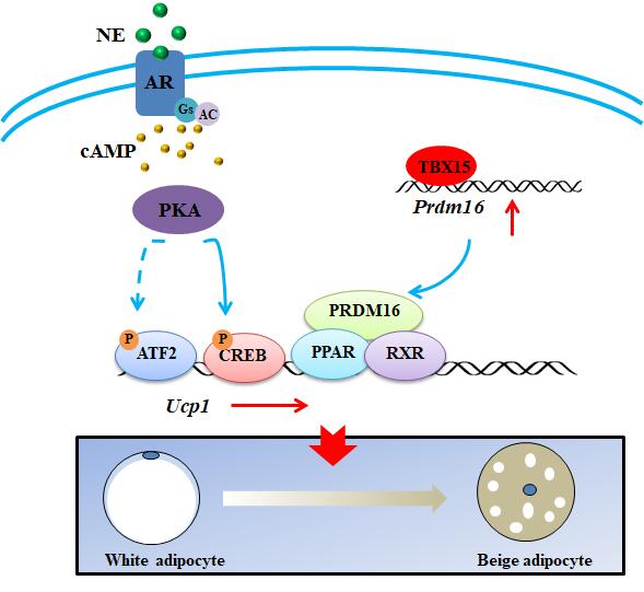 肥胖及其相關(guān)代謝疾病包括Ⅱ型糖尿病、心血管疾病和癌癥等嚴(yán)重威脅人類健康。肥胖的發(fā)生主要由能量失衡導(dǎo)致,因此提高機(jī)體能量消耗能夠有效抑制肥胖發(fā)生。哺乳動物體內(nèi)的褐色脂肪細(xì)胞和米色脂肪細(xì)胞中特異性高表達(dá)解偶聯(lián)蛋白1(UCP1),可以將能量轉(zhuǎn)化為熱量,從而促進(jìn)能耗。通過激活褐色脂肪細(xì)胞產(chǎn)熱及促進(jìn)米色脂肪細(xì)胞生成,進(jìn)而提高機(jī)體能耗,已成為治療肥胖及代謝相關(guān)疾病的研究熱點。
