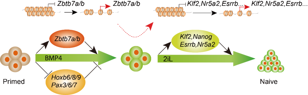 通過(guò)對(duì)BiPNT誘導(dǎo)體系進(jìn)行系統(tǒng)的轉(zhuǎn)錄組測(cè)序(RNA-seq)及染色質(zhì)轉(zhuǎn)座酶可及性測(cè)序(ATAC-seq),聯(lián)合生物信息學(xué)分析,研究人員描繪了BiPNT轉(zhuǎn)變過(guò)程染色質(zhì)可及性動(dòng)態(tài)變化規(guī)律發(fā)現(xiàn)BMP信號(hào)一方面抑制分化相關(guān)位點(diǎn)的開(kāi)放,另一方面促進(jìn)原始態(tài)多能性基因位點(diǎn)的開(kāi)放來(lái)介導(dǎo)PNT轉(zhuǎn)變進(jìn)程。通過(guò)進(jìn)一步的分析,研究人員鑒定出ZBTB7家族轉(zhuǎn)錄因子是新型BMP4下游靶點(diǎn),其中Zbtb7a/b通過(guò)調(diào)控染色質(zhì)重塑影響了PNT進(jìn)程。通過(guò)染色質(zhì)免疫共沉淀技術(shù),研究人員最終證明Zbtb7a直接結(jié)合并激活原始態(tài)多能性基因如Esrrb, Klf2, Nr5a2的表達(dá)來(lái)調(diào)控PNT的轉(zhuǎn)變過(guò)程。
