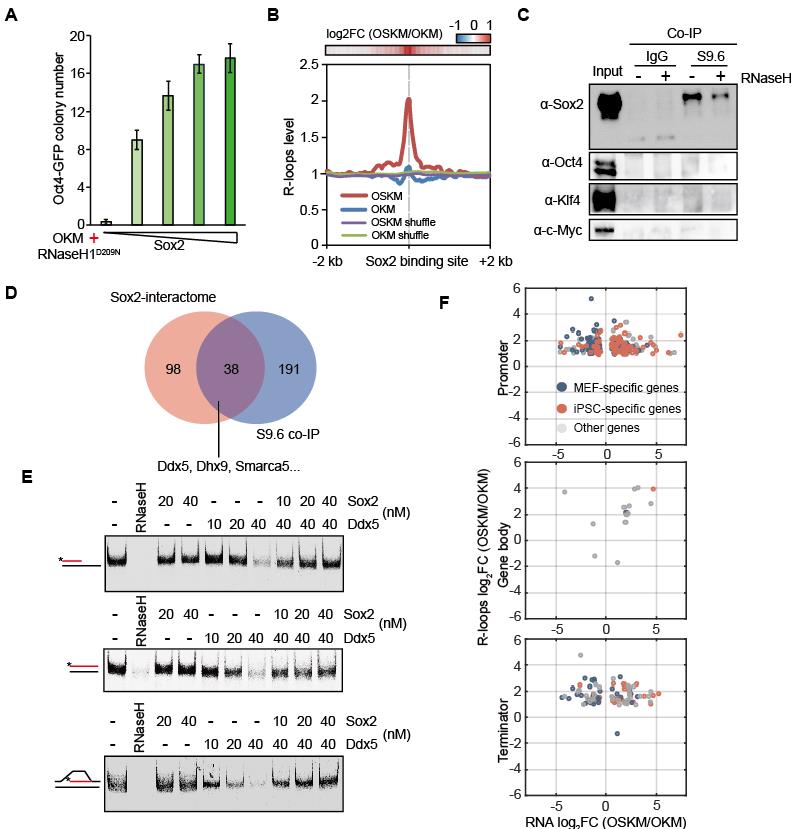 該研究進一步發(fā)現(xiàn)Sox2這一新功能并不依賴于Sox2的轉錄因子活性。體細胞重編程實驗發(fā)現(xiàn)Sox2可回復因Ddx5而被抑制的重編程進程以及上調Ddx5相關調控位點的R-loop水平,進而促進體細胞重編程為多能干細胞。這項研究發(fā)現(xiàn)了Sox2/Ddx5協(xié)同調控R-loop參與體細胞重編程過程,闡明了R-loop對細胞命運調控的重要作用,并揭示了Sox2這一傳統(tǒng)轉錄因子的新功能。