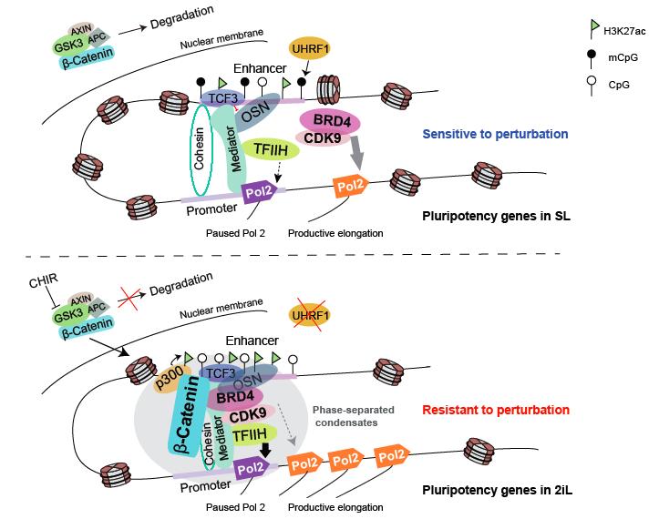 近日,中國(guó)科學(xué)院廣州生物醫(yī)藥與健康研究院Miguel A. Esteban實(shí)驗(yàn)室和以色列魏茨曼科學(xué)研究院Jacob H. Hanna實(shí)驗(yàn)室及武漢大學(xué)陳亮實(shí)驗(yàn)室的研究人員合作在Science Advances在線發(fā)表了文章‘β-Catenin safeguards the ground state of mouse pluripotency by strengthening the robustness of the transcriptional apparatus’。該研究發(fā)現(xiàn)在基態(tài)多能干細(xì)胞中,激活的β-catenin通過(guò)在多能性位點(diǎn)招募輔調(diào)控因子促進(jìn)多能性基因的轉(zhuǎn)錄起始,減少了對(duì)BRD4/CDK9調(diào)控的暫停釋放的依賴(lài),但是對(duì)抑制轉(zhuǎn)錄起始更敏感,從而解釋了基態(tài)多能干細(xì)胞在面臨外界擾動(dòng)時(shí)更穩(wěn)定的原因。但與此同時(shí),胚胎多能干細(xì)胞的細(xì)胞周期相關(guān)的基因仍然高度依賴(lài)暫停釋放機(jī)制進(jìn)行轉(zhuǎn)錄,因此兩種條件下的胚胎多能干細(xì)胞的增殖均對(duì)抑制BRD4/CDK9敏感。