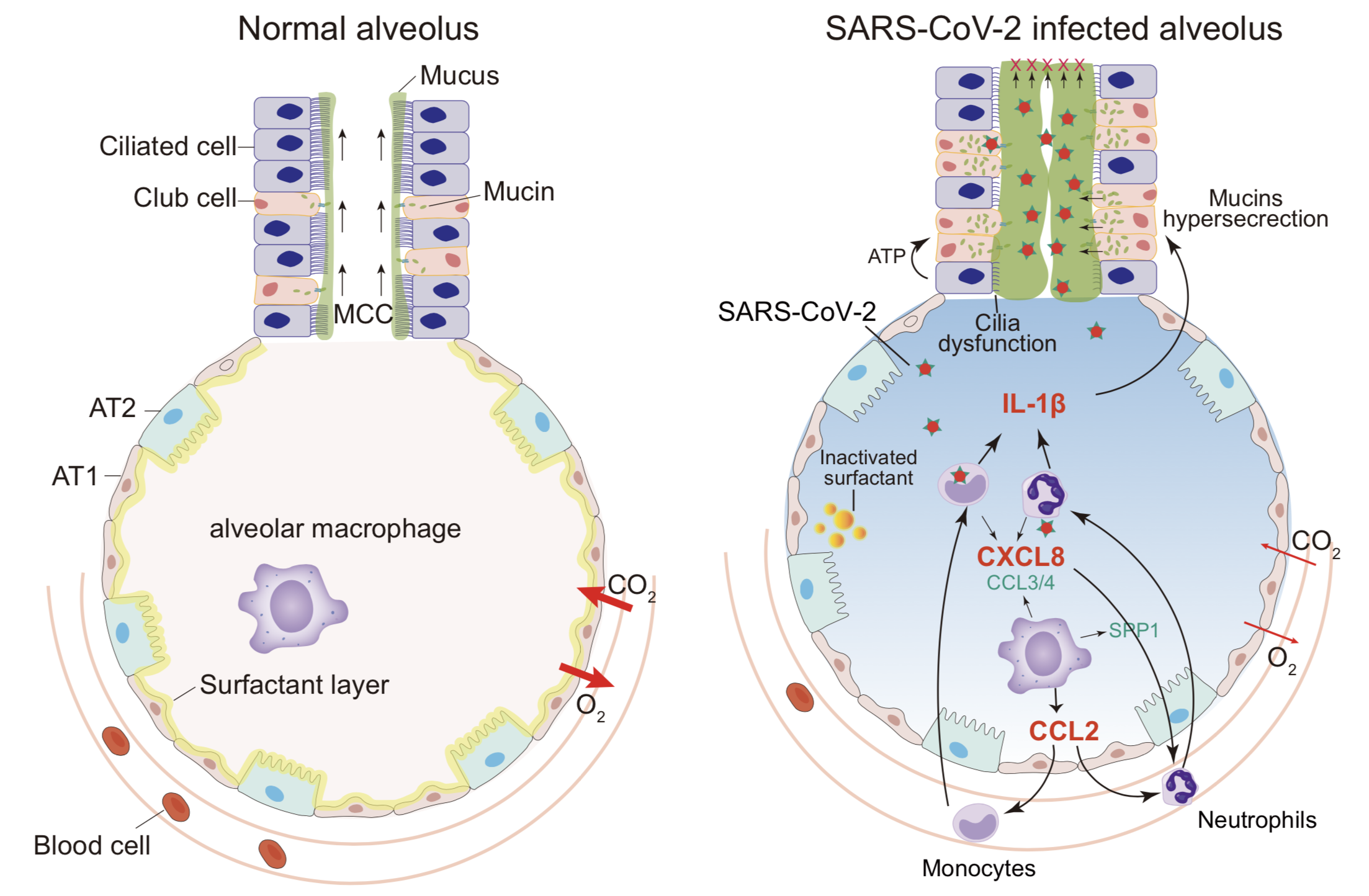 新冠病毒感染導致粘液過度分泌及纖毛受損分子機理示意圖