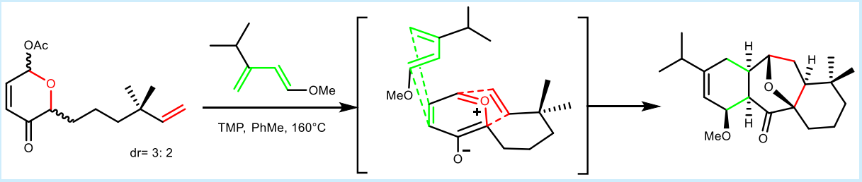 在此工作中,主要利用了串聯(lián)的[5+2]和[4+2]環(huán)化反應(yīng)一步構(gòu)Icetexane二萜類(lèi)天然產(chǎn)物的全碳骨架結(jié)構(gòu)。然后再應(yīng)用二氧化硒實(shí)現(xiàn)C環(huán)的芳構(gòu)化。整個(gè)分子的合成思路與前人大不相同。之前關(guān)于此類(lèi)分子的合成均以芳香C環(huán)為基礎(chǔ),再構(gòu)建A、B環(huán)。而此工作創(chuàng)造性的先構(gòu)建出全碳骨架,最后實(shí)現(xiàn)C環(huán)的芳構(gòu)化。