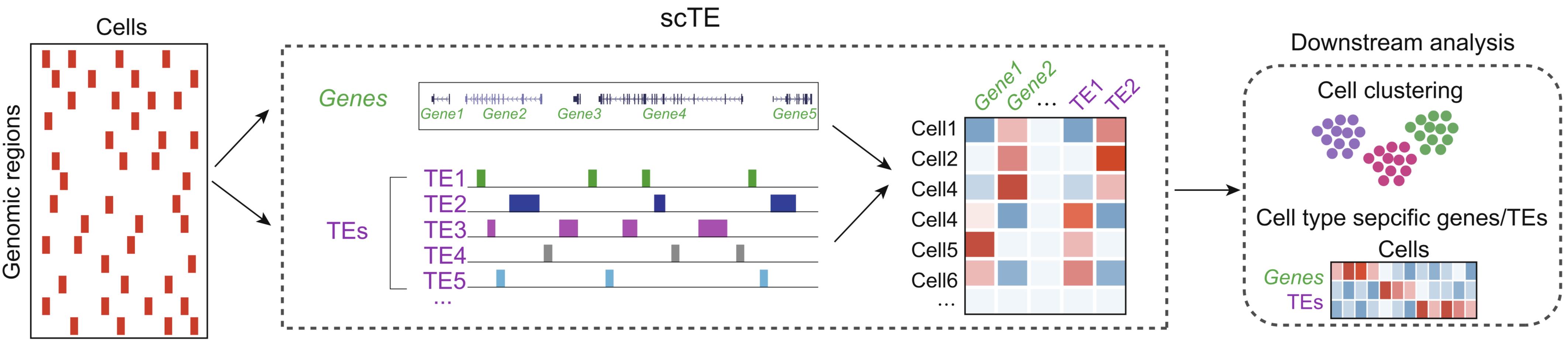 轉(zhuǎn)座元件(TEs)是人類基因組中含量最多的遺傳信息,是指一類能夠在基因組內(nèi)移動的DNA序列。TEs的插入和跳躍可以改變基因組遺傳信息,是物種進化的重要原動力。盡管大部分TEs已經(jīng)喪失了“跳躍”的能力,成為了基因組中的“分子化石”。但近年來研究發(fā)現(xiàn),TEs可以通過影響染色質(zhì)表觀遺傳修飾、轉(zhuǎn)錄因子結(jié)合、RNA編輯以及染色質(zhì)構(gòu)象等,對基因表達起著非常重要的調(diào)控作用。單細胞轉(zhuǎn)錄組測序(scRNA-seq)是研究細胞命運狀態(tài)的絕佳技術,近年來,更多的單細胞測序技術以及相應的生物信息學分析方法也在不斷改進,總體的目標是擴展能捕獲的信息及挖掘能代表生物學功能的潛在維度。然而,目前從scRNA-seq數(shù)據(jù)分析的工具包都只定量基因的表達,分析TEs的表達還比較困難,缺乏相關研究需要的生物信息學分析的工具包,因而忽略了基因組中含量最多的TEs來源的遺傳信息。