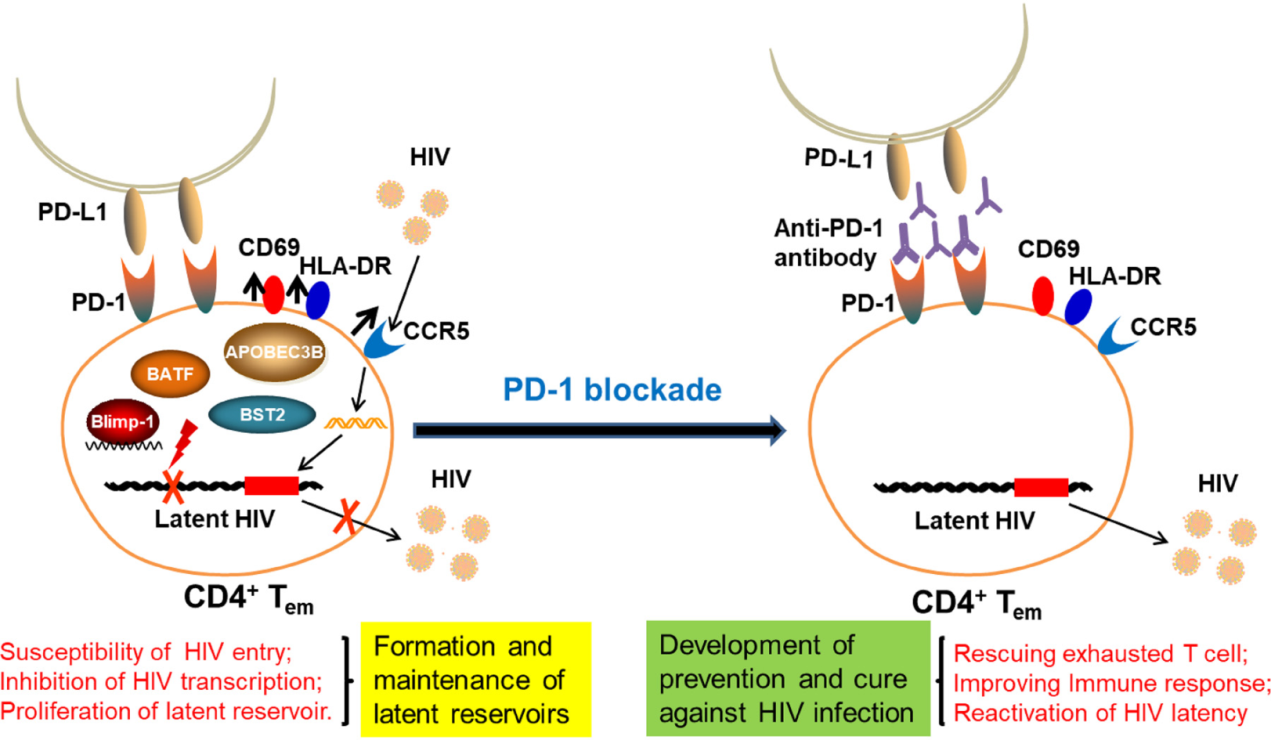 尋找潛伏感染艾滋病毒儲存庫的分子標(biāo)記是實(shí)現(xiàn)艾滋病功能治愈的關(guān)鍵。研究者發(fā)現(xiàn)表達(dá)PD-1的CD4+ T細(xì)胞有利于艾滋病毒入侵并具有利于儲存庫形成的特性,進(jìn)一步證實(shí)艾滋前病毒基因組在這群細(xì)胞中顯著富集,體外PD-1抗體可以激活HIV病毒儲存庫。重要的是,SIV慢性感染獼猴在接受了ART和PD-1抗體治療后,能夠提高獼猴的艾滋特異性免疫應(yīng)答,但在PD-1治療期間中斷ART治療后,病毒載量速度反彈至峰值,加重了艾滋疾病的進(jìn)展。