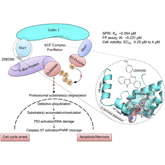 為進(jìn)一步獲得更有效的結(jié)合Skp1的小分子化合物,研究Skp1在腫瘤發(fā)生中的作用,該團隊針對Skp1的結(jié)構(gòu)進(jìn)行大量篩選,結(jié)合分子動力學(xué)研究,發(fā)現(xiàn)小分子Z0933M可以結(jié)合到Skp1的一個疏水口袋。體外實驗發(fā)現(xiàn)Z0933M結(jié)合Skp1的親和性達(dá)到54 nM,并可抑制其和F-box蛋白相互作用;體內(nèi)實驗顯示Z0933M破壞 SCF E3 連接酶的組裝,導(dǎo)致依賴泛素化的蛋白降解和信號傳導(dǎo)功能缺陷、細(xì)胞周期進(jìn)程受損、以及誘導(dǎo)氧化應(yīng)激機制產(chǎn)生,進(jìn)而誘導(dǎo)p53依賴的細(xì)胞凋亡。