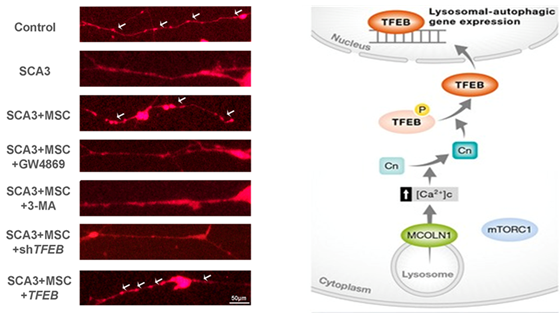 該研究進(jìn)一步發(fā)現(xiàn)hUCMSCs共培養(yǎng)治療可促進(jìn)mTORC1與TFEB分離,促進(jìn)Ca2+從溶酶體釋放,導(dǎo)致TFEB脫磷酸化,易位至細(xì)胞核內(nèi)與CLEAR序列結(jié)合,上調(diào)自噬和溶酶體基因。同時,通過構(gòu)建Tfeb慢病毒干擾和過表達(dá)質(zhì)粒來抑制和激活神經(jīng)元中Tfeb基因的表達(dá),實驗結(jié)果表明, Tfeb基因是hUCMSCs共培養(yǎng)治療激活自噬溶酶體途徑的關(guān)鍵調(diào)節(jié)因子,也是促進(jìn)突變蛋白ataxin-3降解的重要靶點。