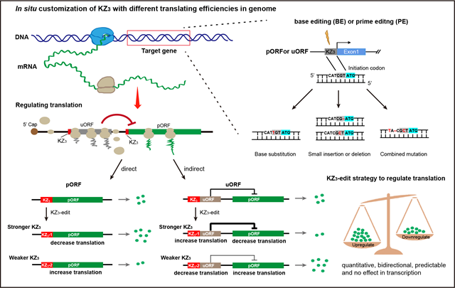 因此,該研究基于對編碼基因Kozak序列的精確操作,提出了一種名為KZ3-edit的新型基因表達調(diào)控策略:利用精準基因編輯技術在DNA水平上精確修飾起始密碼子上游的3個核苷酸(這是Kozak序列的一部分,堿基偏好最顯著,被命名為KZ3),這足以高效調(diào)控基因的翻譯效率。在不改變基因的轉(zhuǎn)錄水平和蛋白質(zhì)序列的情況下,對mRNA的翻譯水平進行定量和雙向調(diào)控,從而將蛋白表達精細地控制在預期的水平。通過體外雙熒光報告系統(tǒng)、綠色熒光細胞系及內(nèi)源基因三個層面,研究人員驗證了KZ3-edit策略的有效性和靈活性,并證實通過精準基因編輯工具對基因主效開放閱讀框(Primary Open Reading Frame, pORF)或uORF起始密碼子上游KZ3序列的單個堿基改變或堿基組合轉(zhuǎn)變,可以實現(xiàn)特定基因翻譯水平的高效調(diào)控。