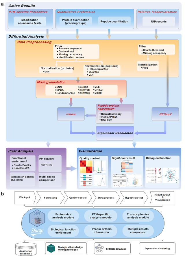 基于超高分辨率液質(zhì)聯(lián)用質(zhì)譜的定量蛋白質(zhì)組學已成為重要的生命科學研究手段。與其它組學方法一樣,恰當?shù)臄?shù)據(jù)分析流程是蛋白質(zhì)組學研究的關(guān)鍵?;谫|(zhì)譜的蛋白質(zhì)組數(shù)據(jù)具有方法儀器多樣、搜庫定量軟件繁多的特點,導致下游的數(shù)據(jù)處理分析更為困難繁瑣,亟需一個可高效處理多樣的蛋白質(zhì)組學數(shù)據(jù)的下游分析工具。