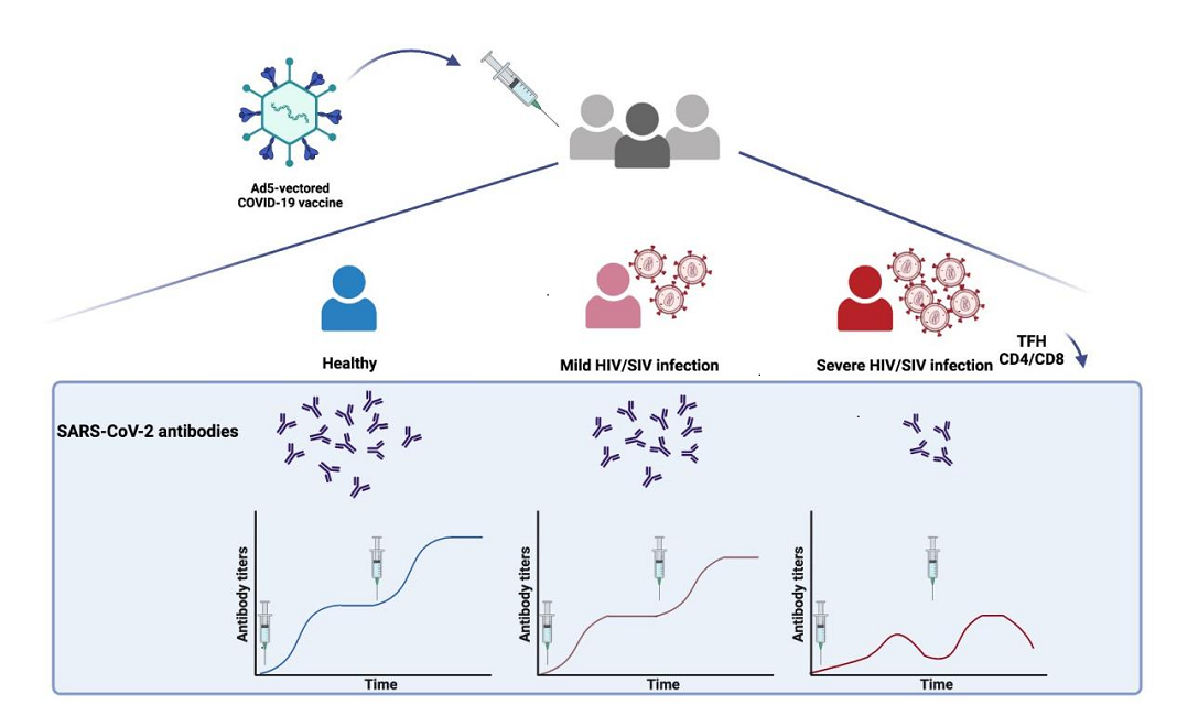 研究者基于2020年研制的腺病毒載體新冠疫苗,可在健康獼猴中誘導(dǎo)保護(hù)性免疫反應(yīng)(Nature Communications. 2020),利用感染猴艾滋病毒的獼猴模型來模擬輕度及重度免疫缺陷的艾滋病人群,研究該腺病毒載體新冠疫苗在艾滋獼猴體內(nèi)的免疫效果。研究發(fā)現(xiàn),單針接種新冠疫苗后,新冠疫苗在輕度免疫缺陷艾滋獼猴(病毒載量小于105 拷貝/毫升血漿)體內(nèi)誘導(dǎo)與健康獼猴相當(dāng)?shù)目贵w和細(xì)胞應(yīng)答,而重度免疫缺陷艾滋獼猴(病毒載量大于105 拷貝/毫升血漿)的抗體和細(xì)胞應(yīng)答的強度和持續(xù)時間則嚴(yán)重受損。兩針加強接種后,輕度免疫缺陷艾滋獼猴與健康獼猴的免疫應(yīng)答水平均迅速升高;同時,70%的重度免疫缺陷艾滋獼猴的免疫應(yīng)答水平也迅速提升,但應(yīng)答水平持續(xù)較短。
