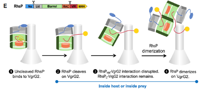 本研究通過生化實驗和冷凍電鏡等手段,捕捉了效應(yīng)蛋白自水解前后瞬間的構(gòu)象變化,發(fā)現(xiàn)RhsP的自水解過程引發(fā)了Rhs桶狀結(jié)構(gòu)的構(gòu)象變化,揭示了釋放核酸酶毒素的分子機制,同時也發(fā)現(xiàn)了VIR區(qū)域構(gòu)象變化促進的RhsP二聚體形成,是其靶向獵物細胞的關(guān)鍵步驟(圖3)。