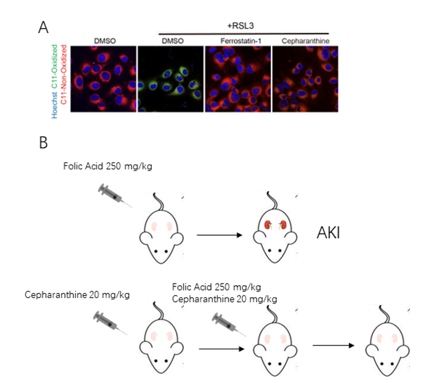 圖A:千金藤素(Cepharanthine)清除脂質(zhì)活性氧;圖B:千金藤素(Cepharanthine)抑制AKI