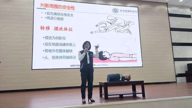 活動(dòng)分為理論知識(shí)講解和實(shí)踐技能培訓(xùn)兩個(gè)部分。理論知識(shí)講解包含健康的生活方式,心腦血管疾病防治,職業(yè)疾病、慢性疾病的預(yù)防及改善等內(nèi)容,以及突發(fā)意外事故緊急救護(hù),例如CPR心肺復(fù)蘇、AED教學(xué)等。講解員通過(guò)理論講解、圖文與視頻展示、現(xiàn)場(chǎng)演示等方式,圍繞心肺復(fù)蘇的指征、最佳救助時(shí)間、救助過(guò)程注意事項(xiàng)、完整CPR現(xiàn)場(chǎng)心肺復(fù)蘇術(shù)規(guī)范操作等進(jìn)行了詳細(xì)的介紹。實(shí)踐操作培訓(xùn)環(huán)節(jié)中,講解員對(duì)心肺復(fù)蘇術(shù)的操作做了示范,并逐一指導(dǎo)參與人員進(jìn)行實(shí)際操作演練,確保大家掌握正確的心肺復(fù)蘇操作手法。