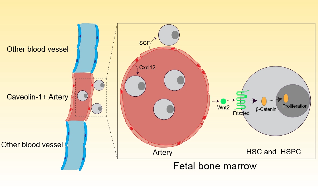 這項研究利用遺傳操作小鼠通過單細胞測序?qū)Ρ确治霭l(fā)現(xiàn),造血干細胞和骨髓微環(huán)境在胚胎期與成年期差異巨大,動脈血管在胚胎骨髓中非常重要。在小鼠胚胎發(fā)育第16.5天,絕大多數(shù)造血干/祖細胞都位于動脈血管旁。研究者發(fā)現(xiàn)此時的骨髓動脈可以釋放Wnt2,動脈來源的Wnt信號影響造血干/祖細胞的擴增。而利用重組蛋白Wnt2在體外處理造血干/祖細胞,可以促進造血干/祖細胞的增殖、增強造血干/祖細胞形成體外克隆的能力。