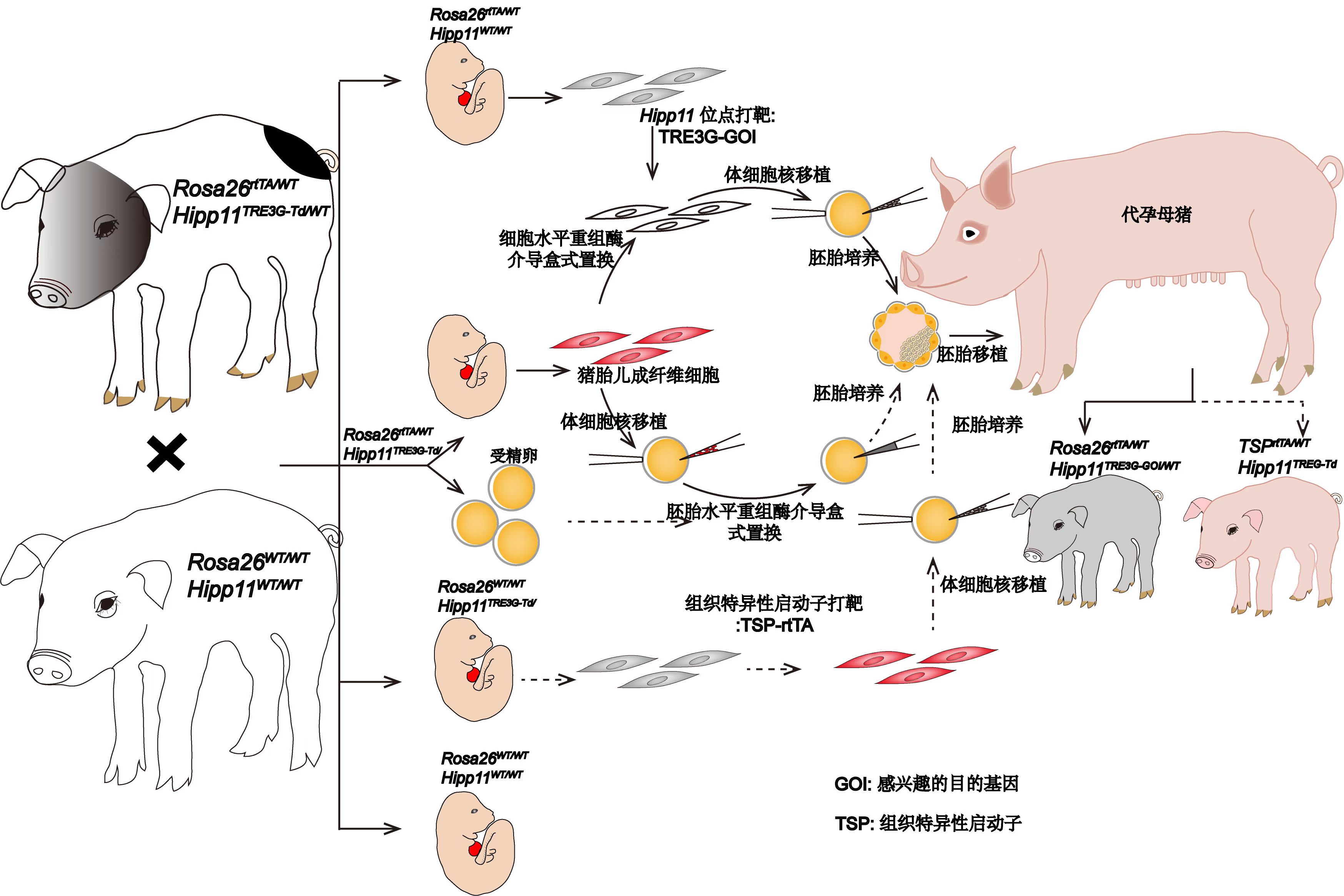 高表達(dá)外源基因的基因修飾豬在生物醫(yī)藥和農(nóng)業(yè)領(lǐng)域具有重要的研究和應(yīng)用價(jià)值。在豬體內(nèi)引入可誘導(dǎo)基因表達(dá)系統(tǒng),可以對(duì)外源基因表達(dá)進(jìn)行精準(zhǔn)的時(shí)空調(diào)控,有利于基因功能的深入剖析和拓展基因修飾豬的應(yīng)用范圍。長(zhǎng)期以來(lái),由于技術(shù)困難,穩(wěn)定、高效的可誘導(dǎo)表達(dá)外源基因工具豬模型一直未能建立。隨著基因編輯技術(shù)的快速發(fā)展,高效構(gòu)建各種類型的基因突變,包括單基因敲入、單或多基因敲除/點(diǎn)突變的基因修飾豬模型成為可能,這為在豬上構(gòu)建穩(wěn)定可靠的可誘導(dǎo)基因表達(dá)體系提供了技術(shù)保障。
