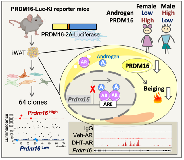 PRDM16是白色脂肪細(xì)胞褐色化的關(guān)鍵轉(zhuǎn)錄因子。在本課題中,課題組研究人員通過PRDM16報(bào)告小鼠模型和單克隆篩選技術(shù),系統(tǒng)性的分析了細(xì)胞全轉(zhuǎn)錄因子譜(1600個(gè))與PRDM16的表達(dá)水平相關(guān)性,發(fā)現(xiàn)雄激素受體(AR)與PRDM16呈現(xiàn)最強(qiáng)的負(fù)相關(guān)性。細(xì)胞及動(dòng)物水平實(shí)驗(yàn)進(jìn)一步證實(shí)雄激素受體直接結(jié)合Prdm16基因位點(diǎn),抑制其轉(zhuǎn)錄表達(dá),脂肪細(xì)胞特異性敲除雄激素受體小鼠的米色脂肪細(xì)胞活性增強(qiáng);而脂肪細(xì)胞高表達(dá)雄激素受體的小鼠則表現(xiàn)出米色化減弱。此外,值得一提的是,本研究同時(shí)發(fā)現(xiàn)人體脂肪組織中PRDM16 的表達(dá)存在性別差異——相比男性個(gè)體,女性具有更高的PRDM16表達(dá)水平,從臨床上證實(shí)了雄激素及其受體通路對(duì)PRDM16和米色脂肪的抑制作用。該工作從多方面證實(shí)了雄激素受體在米色脂肪細(xì)胞的負(fù)調(diào)控作用,為理解脂肪組織的性別差異提供了新的觀點(diǎn)。