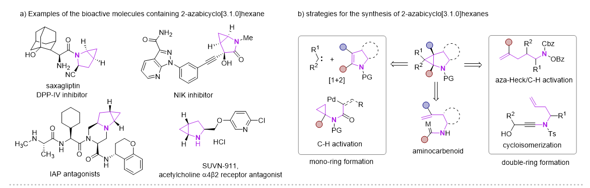 2-氮雜雙環(huán)[3.1.0]己烷骨架因其獨(dú)特的結(jié)構(gòu)優(yōu)勢,廣泛應(yīng)用在藥物分子、生物活性分子以及有機(jī)合成領(lǐng)域,其中三元環(huán)的存在可以降低分子的親脂性以及調(diào)節(jié)N-中心的堿性。目前這類骨架的合成主要方法有Simmons-Smith環(huán)丙烷化、Kulinkovich環(huán)丙烷化、鈀催化分子內(nèi)碳?xì)浠罨?、以及分子?nèi)環(huán)異構(gòu)化實(shí)現(xiàn)。但這些多數(shù)都集中在其消旋體的構(gòu)建,以及N上通常需要保護(hù)。